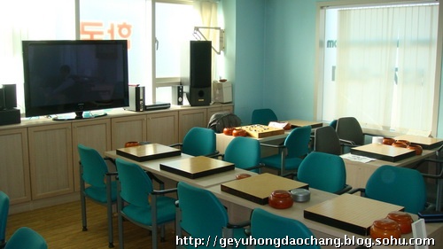 安顿好以后回到权道场,进入院生研究室。房间不大,摆着九盘棋。房间右手角落里是徐奉洙老师下指导棋的专座。朴升哲老师已经在和一个女院生下起指导棋,李元伶初段和一个院生在下10秒的快棋,用的棋钟是中国国内普遍都在使用的全棋电子语音钟。