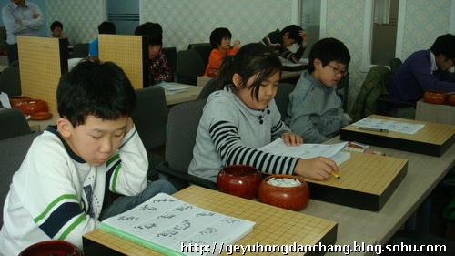13:52,权道场开始对所有学员进行死活考试。看来难度不一样,有两套卷子,难和易的,每卷12道。由李康旭二段负责监考,他不时轻声说两句,和阳川大 一道场的玉德真老师一样,好像在交代在死活注意事项。交卷时间是15:30。一个半小时做12题,看来题量和葛道场比起来少多了,但不知道要求的质量有多 高。考试的学员年龄相差比较大,有很多年龄小的,大概各占一半,考试的气氛比较轻松,小的有几个注意力不是很集中。看来中韩道场在培养年龄小棋力稍低的小 朋友方面,都存在共同的难题。
